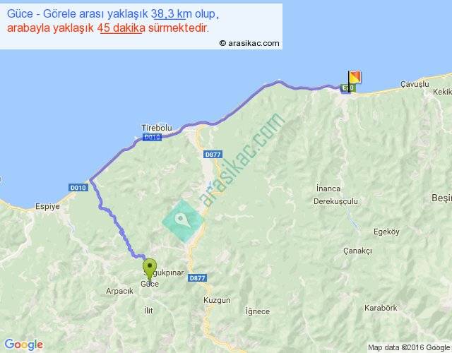 Güce - Görele arası yaklaşık olarak 90 km/h ile yukarıda belirtilen sürede olup, iki yerin kuş uçuşu uzaklığı (mesafesi) 22'dir. Yolculuk otobüsle 58 dakika sürmektedir.