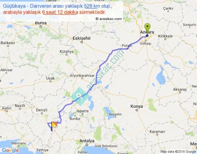 Güçlükaya - Darıveren arası yaklaşık olarak 90 km/h ile yukarıda belirtilen sürede olup, iki yerin kuş uçuşu uzaklığı (mesafesi) 419'dir. Eğer belirtilen yerler arasında uçak seferi var ise bu süre uçakla 38 dakika'ya kadar düşebilir. Yolculuk otobüsle 8 saat 3 dakika sürmektedir.