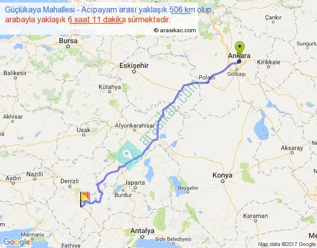 Güçlükaya Mahallesi - Acıpayam arası yaklaşık olarak 90 km/h ile yukarıda belirtilen sürede olup, iki yerin kuş uçuşu uzaklığı (mesafesi) 414'dir. Eğer belirtilen yerler arasında uçak seferi var ise bu süre uçakla 38 dakika'ya kadar düşebilir. Yolculuk otobüsle 8 saat 2 dakika sürmektedir.