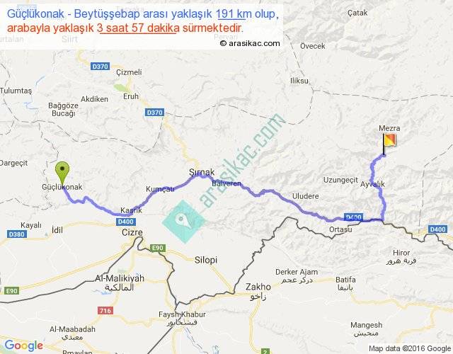 Güçlükonak - Beytüşşebap arası yaklaşık olarak 90 km/h ile yukarıda belirtilen sürede olup, iki yerin kuş uçuşu uzaklığı (mesafesi) 110'dir. Yolculuk otobüsle 5 saat 8 dakika sürmektedir.