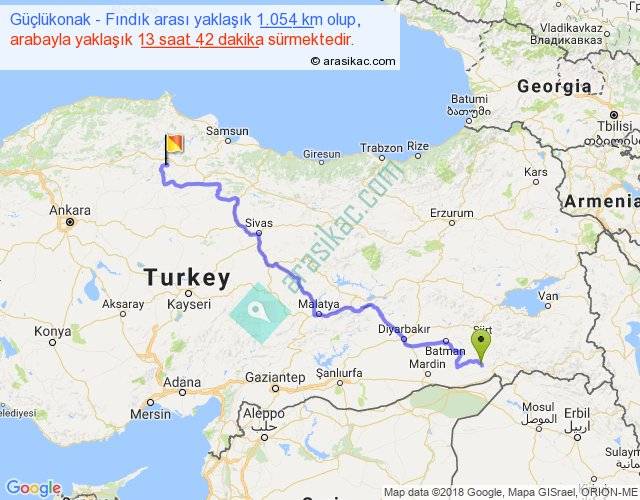 Güçlükonak - Fındık arası yaklaşık olarak 90 km/h ile yukarıda belirtilen sürede olup, iki yerin kuş uçuşu uzaklığı (mesafesi) 701'dir. Eğer belirtilen yerler arasında uçak seferi var ise bu süre uçakla 1 saat 04 dakika'ya kadar düşebilir. Yolculuk otobüsle 17 saat 48 dakika sürmektedir.
