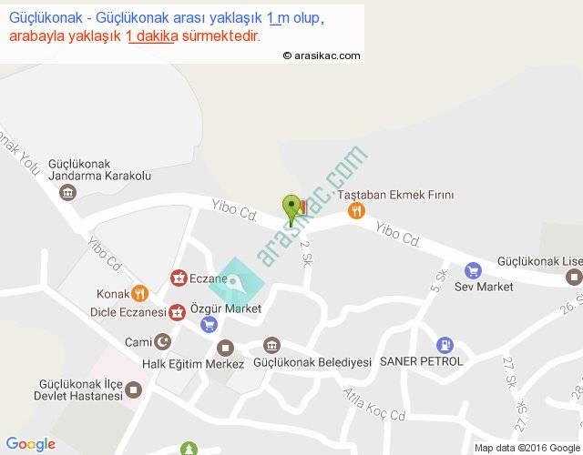 Güçlükonak - Güçlükonak arası yaklaşık olarak 90 km/h ile yukarıda belirtilen sürede olup, iki yerin kuş uçuşu uzaklığı (mesafesi) 0'dir. Yolculuk otobüsle 1 dakika sürmektedir.