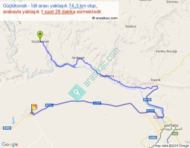 Güçlükonak - İdil arası yaklaşık olarak 90 km/h ile yukarıda belirtilen sürede olup, iki yerin kuş uçuşu uzaklığı (mesafesi) 15'dir. Yolculuk otobüsle 1 saat 54 dakika sürmektedir.