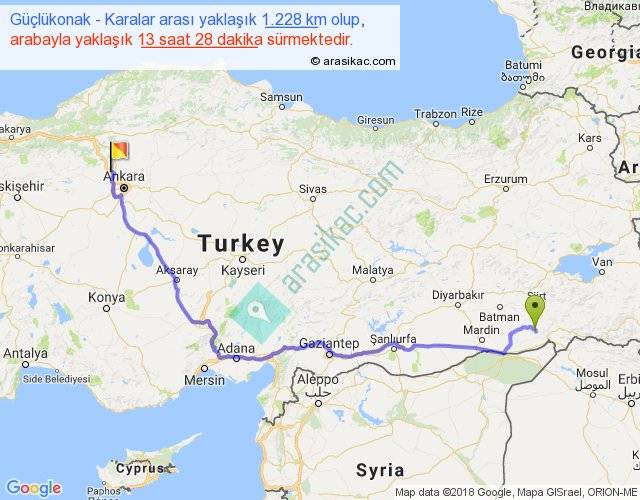 Güçlükonak - Karalar arası yaklaşık olarak 90 km/h ile yukarıda belirtilen sürede olup, iki yerin kuş uçuşu uzaklığı (mesafesi) 856'dir. Eğer belirtilen yerler arasında uçak seferi var ise bu süre uçakla 1 saat 19 dakika'ya kadar düşebilir. Yolculuk otobüsle 17 saat 30 dakika sürmektedir.