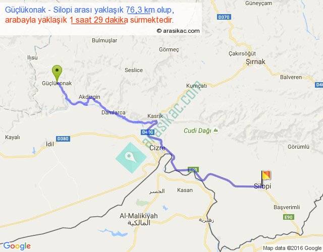 Güçlükonak - Silopi arası yaklaşık olarak 90 km/h ile yukarıda belirtilen sürede olup, iki yerin kuş uçuşu uzaklığı (mesafesi) 55'dir. Yolculuk otobüsle 1 saat 55 dakika sürmektedir.