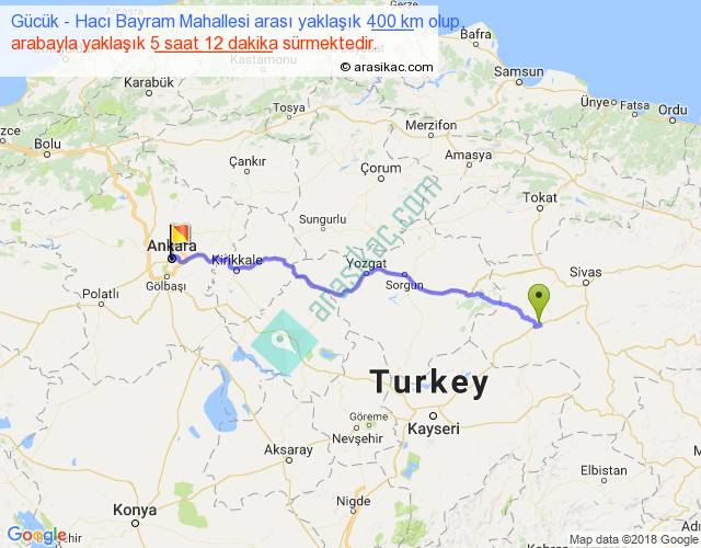Gücük - Hacı Bayram Mahallesi arası yaklaşık olarak 90 km/h ile yukarıda belirtilen sürede olup, iki yerin kuş uçuşu uzaklığı (mesafesi) 318'dir. Eğer belirtilen yerler arasında uçak seferi var ise bu süre uçakla 29 dakika'ya kadar düşebilir. Yolculuk otobüsle 6 saat 45 dakika sürmektedir.