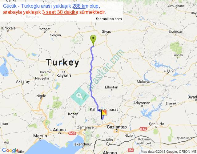 Gücük - Türkoğlu arası yaklaşık olarak 90 km/h ile yukarıda belirtilen sürede olup, iki yerin kuş uçuşu uzaklığı (mesafesi) 229'dir. Yolculuk otobüsle 4 saat 43 dakika sürmektedir.