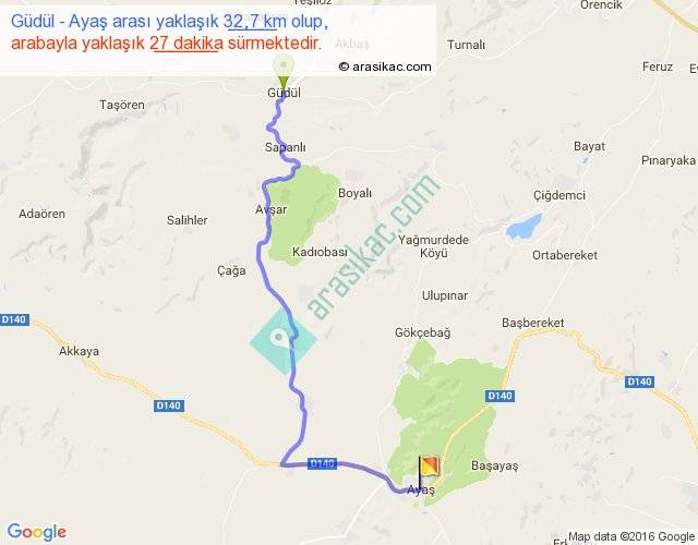 Güdül - Ayaş arası yaklaşık olarak 90 km/h ile yukarıda belirtilen sürede olup, iki yerin kuş uçuşu uzaklığı (mesafesi) 22'dir. Yolculuk otobüsle 35 dakika sürmektedir.