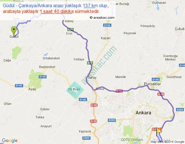 Güdül - Çankaya Ankara arası yaklaşık olarak 90 km/h ile yukarıda belirtilen sürede olup, iki yerin kuş uçuşu uzaklığı (mesafesi) 70'dir. Yolculuk otobüsle 2 saat 10 dakika sürmektedir.