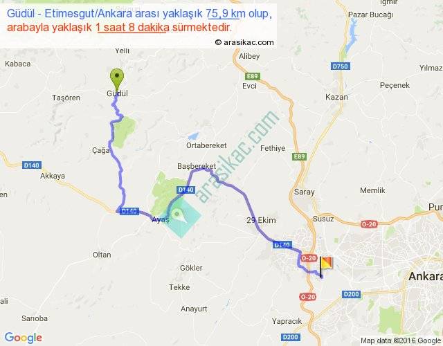 Güdül - Etimesgut Ankara arası yaklaşık olarak 90 km/h ile yukarıda belirtilen sürede olup, iki yerin kuş uçuşu uzaklığı (mesafesi) 46'dir. Yolculuk otobüsle 1 saat 28 dakika sürmektedir.