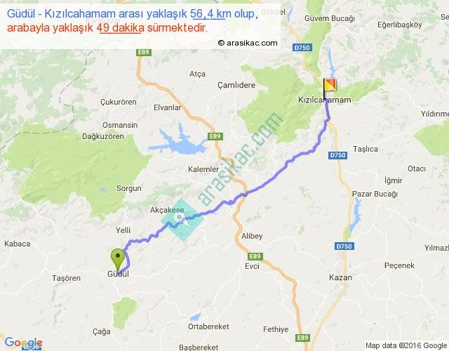 Güdül - Kızılcahamam arası yaklaşık olarak 90 km/h ile yukarıda belirtilen sürede olup, iki yerin kuş uçuşu uzaklığı (mesafesi) 45'dir. Yolculuk otobüsle 1 saat 3 dakika sürmektedir.