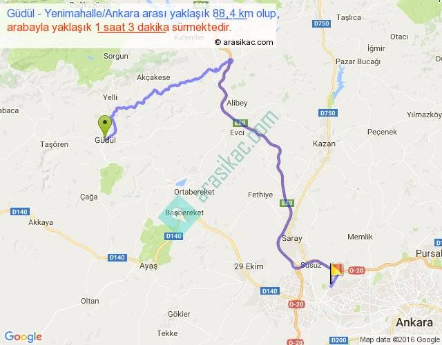 Güdül - Yenimahalle Ankara arası yaklaşık olarak 90 km/h ile yukarıda belirtilen sürede olup, iki yerin kuş uçuşu uzaklığı (mesafesi) 45'dir. Yolculuk otobüsle 1 saat 21 dakika sürmektedir.