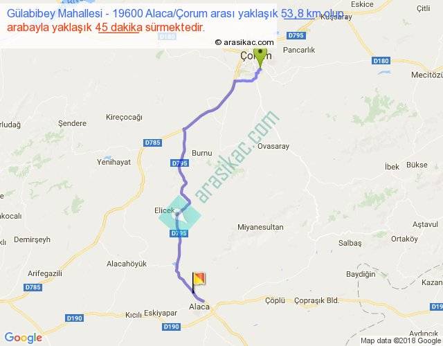 Gülabibey Mahallesi - 19600 Alaca Çorum arası yaklaşık olarak 90 km/h ile yukarıda belirtilen sürede olup, iki yerin kuş uçuşu uzaklığı (mesafesi) 39'dir. Yolculuk otobüsle 58 dakika sürmektedir.