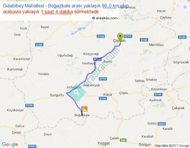 Gülabibey Mahallesi - Boğazkale arası yaklaşık olarak 90 km/h ile yukarıda belirtilen sürede olup, iki yerin kuş uçuşu uzaklığı (mesafesi) 63'dir. Yolculuk otobüsle 1 saat 23 dakika sürmektedir.