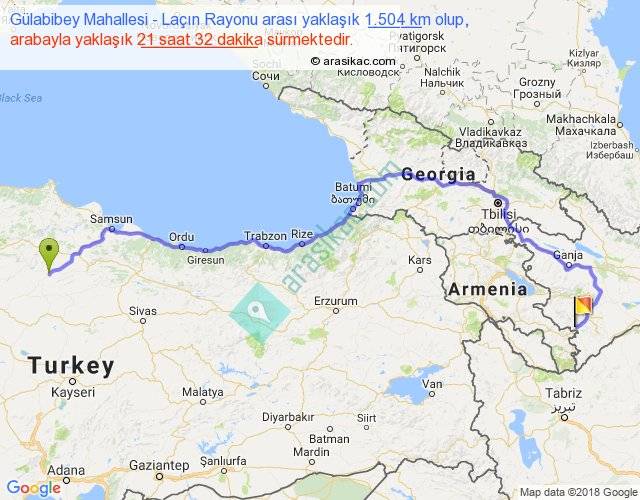 Gülabibey Mahallesi - Laçın Rayonu arası yaklaşık olarak 90 km/h ile yukarıda belirtilen sürede olup, iki yerin kuş uçuşu uzaklığı (mesafesi) 984'dir. Eğer belirtilen yerler arasında uçak seferi var ise bu süre uçakla 1 saat 30 dakika'ya kadar düşebilir. Yolculuk otobüsle 1 gün 3 saat sürmektedir.