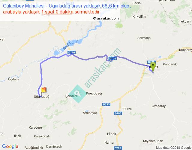 Gülabibey Mahallesi - Uğurludağ arası yaklaşık olarak 90 km/h ile yukarıda belirtilen sürede olup, iki yerin kuş uçuşu uzaklığı (mesafesi) 44'dir. Yolculuk otobüsle 1 saat 18 dakika sürmektedir.