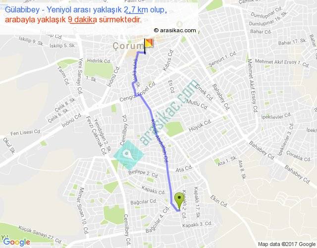 Gülabibey - Yeniyol arası yaklaşık olarak 90 km/h ile yukarıda belirtilen sürede olup, iki yerin kuş uçuşu uzaklığı (mesafesi) 2'dir. Yolculuk otobüsle 11 dakika sürmektedir.