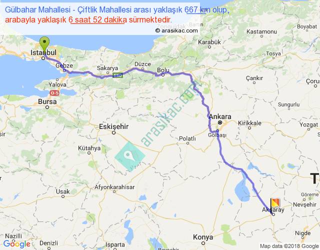 Gülbahar Mahallesi - Çiftlik Mahallesi arası yaklaşık olarak 90 km/h ile yukarıda belirtilen sürede olup, iki yerin kuş uçuşu uzaklığı (mesafesi) 518'dir. Eğer belirtilen yerler arasında uçak seferi var ise bu süre uçakla 47 dakika'ya kadar düşebilir. Yolculuk otobüsle 8 saat 55 dakika sürmektedir.
