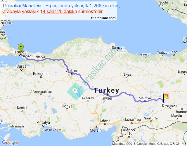 Gülbahar Mahallesi - Ergani arası yaklaşık olarak 90 km/h ile yukarıda belirtilen sürede olup, iki yerin kuş uçuşu uzaklığı (mesafesi) 966'dir. Eğer belirtilen yerler arasında uçak seferi var ise bu süre uçakla 1 saat 29 dakika'ya kadar düşebilir. Yolculuk otobüsle 18 saat 38 dakika sürmektedir.