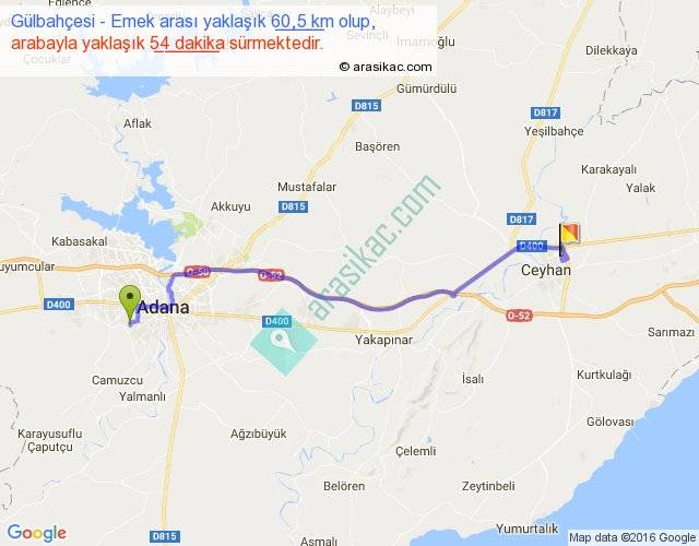 Gülbahçesi - Emek arası yaklaşık olarak 90 km/h ile yukarıda belirtilen sürede olup, iki yerin kuş uçuşu uzaklığı (mesafesi) 49'dir. Yolculuk otobüsle 1 saat 10 dakika sürmektedir.