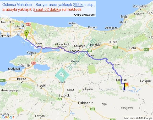 Gülensu Mahallesi - Sarıyar arası yaklaşık olarak 90 km/h ile yukarıda belirtilen sürede olup, iki yerin kuş uçuşu uzaklığı (mesafesi) 215'dir. Yolculuk otobüsle 5 saat 1 dakika sürmektedir.