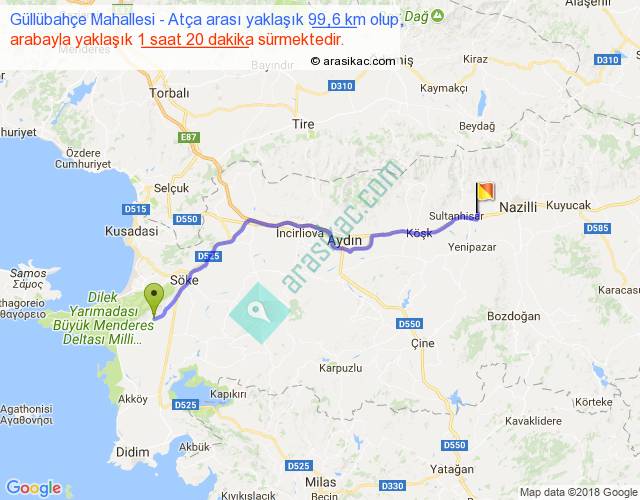 Güllübahçe Mahallesi - Atça arası yaklaşık olarak 90 km/h ile yukarıda belirtilen sürede olup, iki yerin kuş uçuşu uzaklığı (mesafesi) 82'dir. Yolculuk otobüsle 1 saat 44 dakika sürmektedir.