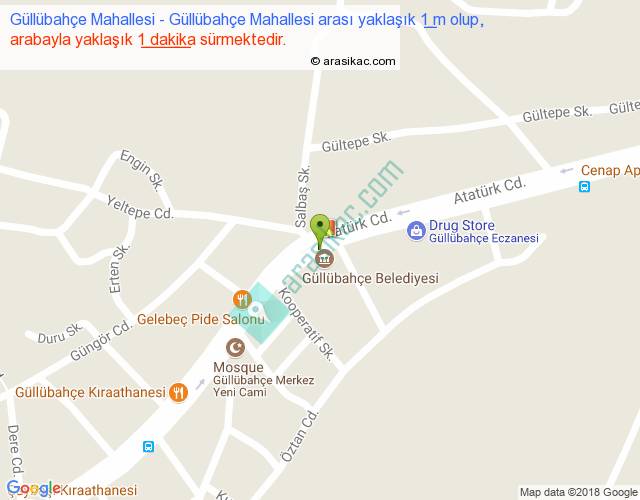 Güllübahçe Mahallesi - Güllübahçe Mahallesi arası yaklaşık olarak 90 km/h ile yukarıda belirtilen sürede olup, iki yerin kuş uçuşu uzaklığı (mesafesi) 0'dir. Yolculuk otobüsle 1 dakika sürmektedir.