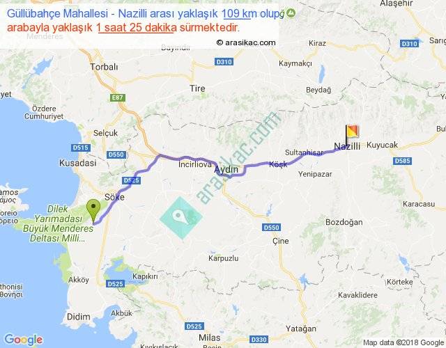 Güllübahçe Mahallesi - Nazilli arası yaklaşık olarak 90 km/h ile yukarıda belirtilen sürede olup, iki yerin kuş uçuşu uzaklığı (mesafesi) 92'dir. Yolculuk otobüsle 1 saat 50 dakika sürmektedir.