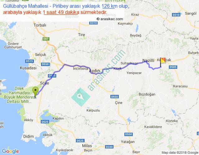 Güllübahçe Mahallesi - Pirlibey arası yaklaşık olarak 90 km/h ile yukarıda belirtilen sürede olup, iki yerin kuş uçuşu uzaklığı (mesafesi) 100'dir. Yolculuk otobüsle 2 saat 21 dakika sürmektedir.