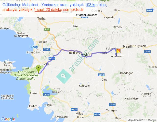 Güllübahçe Mahallesi - Yenipazar arası yaklaşık olarak 90 km/h ile yukarıda belirtilen sürede olup, iki yerin kuş uçuşu uzaklığı (mesafesi) 78'dir. Yolculuk otobüsle 1 saat 44 dakika sürmektedir.