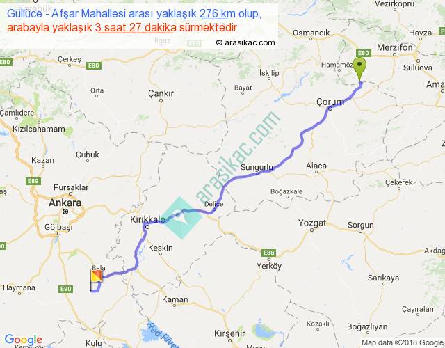 Güllüce - Afşar Mahallesi arası yaklaşık olarak 90 km/h ile yukarıda belirtilen sürede olup, iki yerin kuş uçuşu uzaklığı (mesafesi) 227'dir. Yolculuk otobüsle 4 saat 29 dakika sürmektedir.