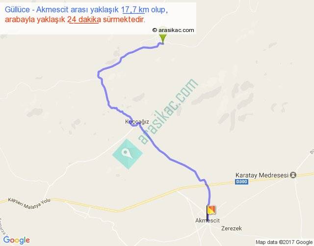 Güllüce - Akmescit arası yaklaşık olarak 90 km/h ile yukarıda belirtilen sürede olup, iki yerin kuş uçuşu uzaklığı (mesafesi) 11'dir. Yolculuk otobüsle 31 dakika sürmektedir.