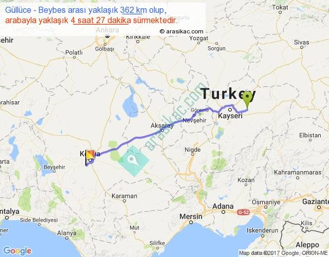 Güllüce - Beybes arası yaklaşık olarak 90 km/h ile yukarıda belirtilen sürede olup, iki yerin kuş uçuşu uzaklığı (mesafesi) 316'dir. Eğer belirtilen yerler arasında uçak seferi var ise bu süre uçakla 29 dakika'ya kadar düşebilir. Yolculuk otobüsle 5 saat 47 dakika sürmektedir.