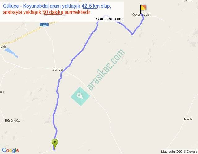 Güllüce - Koyunabdal arası yaklaşık olarak 90 km/h ile yukarıda belirtilen sürede olup, iki yerin kuş uçuşu uzaklığı (mesafesi) 31'dir. Yolculuk otobüsle 1 saat 5 dakika sürmektedir.
