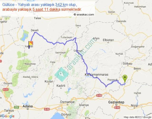 Güllüce - Yahyalı arası yaklaşık olarak 90 km/h ile yukarıda belirtilen sürede olup, iki yerin kuş uçuşu uzaklığı (mesafesi) 206'dir. Yolculuk otobüsle 6 saat 44 dakika sürmektedir.