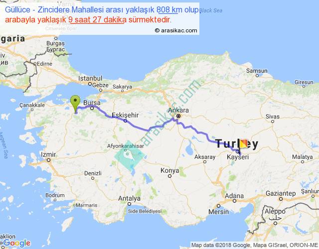 Güllüce - Zincidere Mahallesi arası yaklaşık olarak 90 km/h ile yukarıda belirtilen sürede olup, iki yerin kuş uçuşu uzaklığı (mesafesi) 640'dir. Eğer belirtilen yerler arasında uçak seferi var ise bu süre uçakla 59 dakika'ya kadar düşebilir. Yolculuk otobüsle 12 saat 17 dakika sürmektedir.
