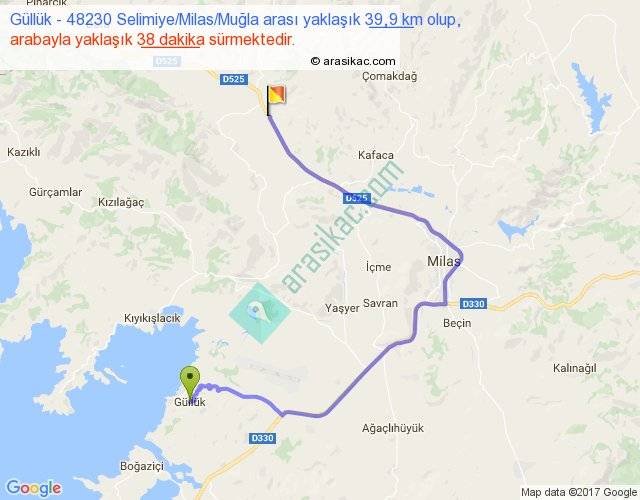 Güllük - 48230 Selimiye Milas Muğla arası yaklaşık olarak 90 km/h ile yukarıda belirtilen sürede olup, iki yerin kuş uçuşu uzaklığı (mesafesi) 18'dir. Yolculuk otobüsle 49 dakika sürmektedir.