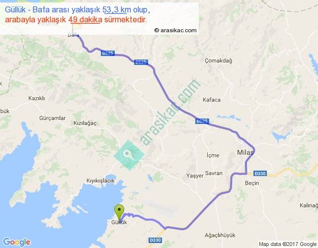 Güllük - Bafa arası yaklaşık olarak 90 km/h ile yukarıda belirtilen sürede olup, iki yerin kuş uçuşu uzaklığı (mesafesi) 23'dir. Yolculuk otobüsle 1 saat 3 dakika sürmektedir.