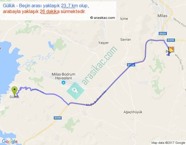 Güllük - Beçin arası yaklaşık olarak 90 km/h ile yukarıda belirtilen sürede olup, iki yerin kuş uçuşu uzaklığı (mesafesi) 17'dir. Yolculuk otobüsle 33 dakika sürmektedir.
