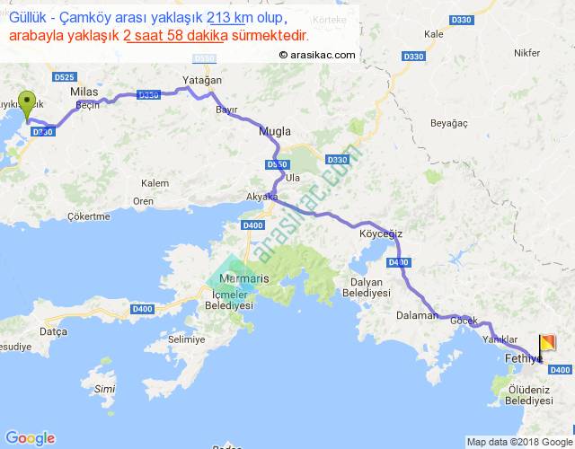 Güllük - Çamköy arası yaklaşık olarak 90 km/h ile yukarıda belirtilen sürede olup, iki yerin kuş uçuşu uzaklığı (mesafesi) 153'dir. Yolculuk otobüsle 3 saat 51 dakika sürmektedir.