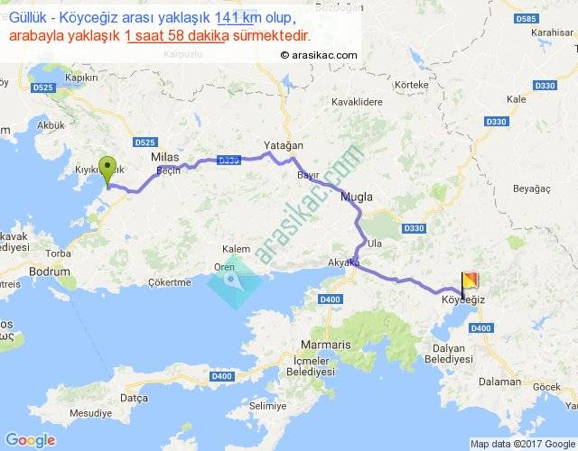 Güllük - Köyceğiz arası yaklaşık olarak 90 km/h ile yukarıda belirtilen sürede olup, iki yerin kuş uçuşu uzaklığı (mesafesi) 100'dir. Yolculuk otobüsle 2 saat 33 dakika sürmektedir.
