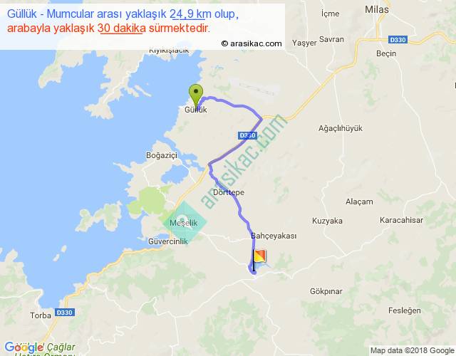 Güllük - Mumcular arası yaklaşık olarak 90 km/h ile yukarıda belirtilen sürede olup, iki yerin kuş uçuşu uzaklığı (mesafesi) 15'dir. Yolculuk otobüsle 39 dakika sürmektedir.