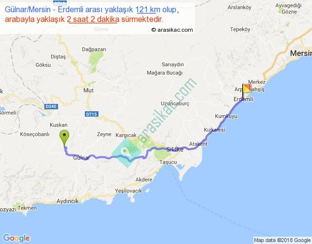 Gülnar Mersin - Erdemli arası yaklaşık olarak 90 km/h ile yukarıda belirtilen sürede olup, iki yerin kuş uçuşu uzaklığı (mesafesi) 93'dir. Yolculuk otobüsle 2 saat 38 dakika sürmektedir.