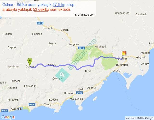 Gülnar - Silifke arası yaklaşık olarak 90 km/h ile yukarıda belirtilen sürede olup, iki yerin kuş uçuşu uzaklığı (mesafesi) 47'dir. Yolculuk otobüsle 1 saat 8 dakika sürmektedir.