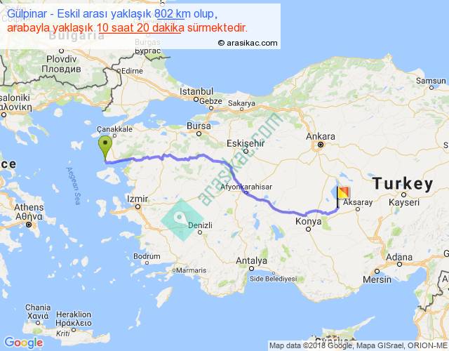 Gülpinar - Eskil arası yaklaşık olarak 90 km/h ile yukarıda belirtilen sürede olup, iki yerin kuş uçuşu uzaklığı (mesafesi) 639'dir. Eğer belirtilen yerler arasında uçak seferi var ise bu süre uçakla 58 dakika'ya kadar düşebilir. Yolculuk otobüsle 13 saat 26 dakika sürmektedir.