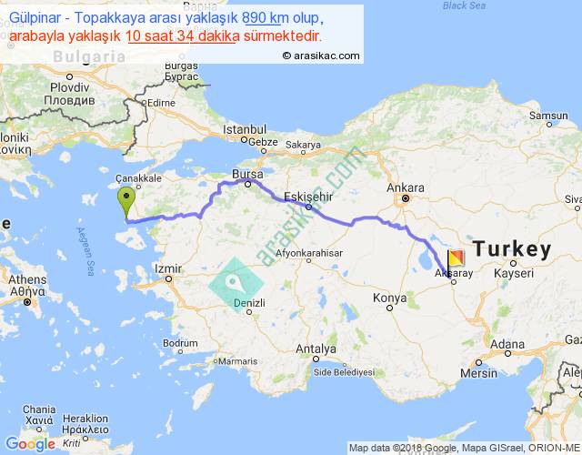 Gülpinar - Topakkaya arası yaklaşık olarak 90 km/h ile yukarıda belirtilen sürede olup, iki yerin kuş uçuşu uzaklığı (mesafesi) 681'dir. Eğer belirtilen yerler arasında uçak seferi var ise bu süre uçakla 1 saat 02 dakika'ya kadar düşebilir. Yolculuk otobüsle 13 saat 44 dakika sürmektedir.