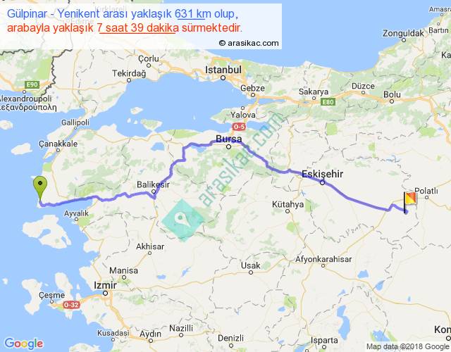 Gülpinar - Yenikent arası yaklaşık olarak 90 km/h ile yukarıda belirtilen sürede olup, iki yerin kuş uçuşu uzaklığı (mesafesi) 487'dir. Eğer belirtilen yerler arasında uçak seferi var ise bu süre uçakla 44 dakika'ya kadar düşebilir. Yolculuk otobüsle 9 saat 56 dakika sürmektedir.