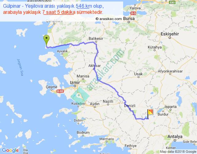 Gülpinar - Yeşilova arası yaklaşık olarak 90 km/h ile yukarıda belirtilen sürede olup, iki yerin kuş uçuşu uzaklığı (mesafesi) 386'dir. Eğer belirtilen yerler arasında uçak seferi var ise bu süre uçakla 35 dakika'ya kadar düşebilir. Yolculuk otobüsle 9 saat 12 dakika sürmektedir.