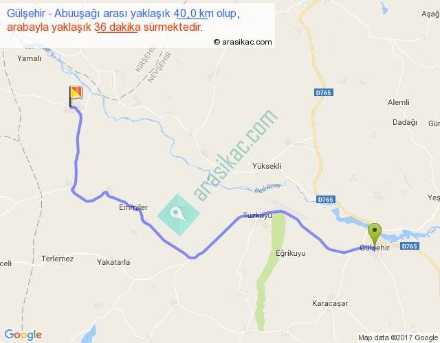 Gülşehir - Abuuşağı arası yaklaşık olarak 90 km/h ile yukarıda belirtilen sürede olup, iki yerin kuş uçuşu uzaklığı (mesafesi) 29'dir. Yolculuk otobüsle 46 dakika sürmektedir.