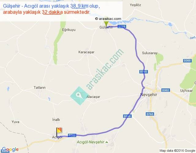 Gülşehir - Acıgöl arası yaklaşık olarak 90 km/h ile yukarıda belirtilen sürede olup, iki yerin kuş uçuşu uzaklığı (mesafesi) 23'dir. Yolculuk otobüsle 41 dakika sürmektedir.